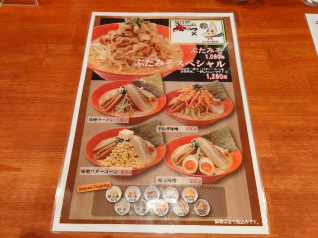 厨房前のカウンター席と壁際のテーブル席、13時で先客さん2名、当方おひとり様なのでカウンター席奥にひっそりと着きます。メニューは味噌ラーメン5種と餃子6種、30種の組み合わせが可能です^^