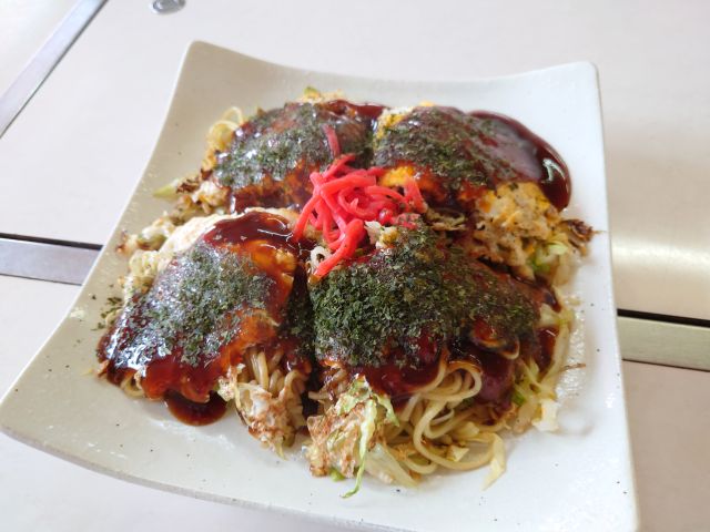 注文はそばモダン(700円)、女将さんが鉄板で丁寧に焼いてくださいます。メリケン輪っかは普通サイズ、じっくり時間を掛けて焼き上げます。そばは別に炒めて終盤に合体です。15分程で完成、4分割で皿に盛ってくださいます。