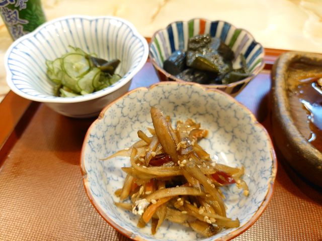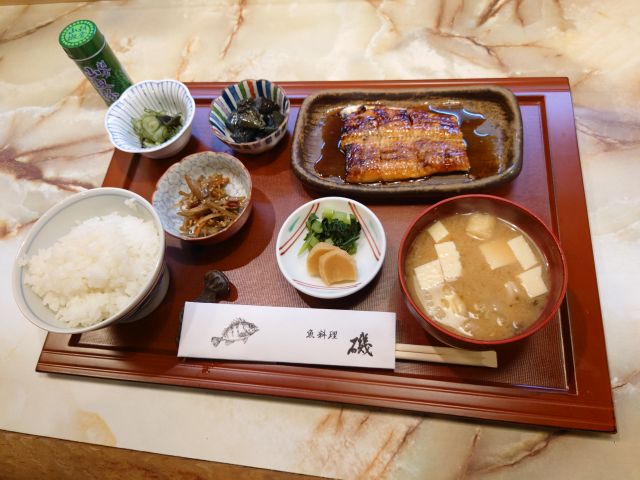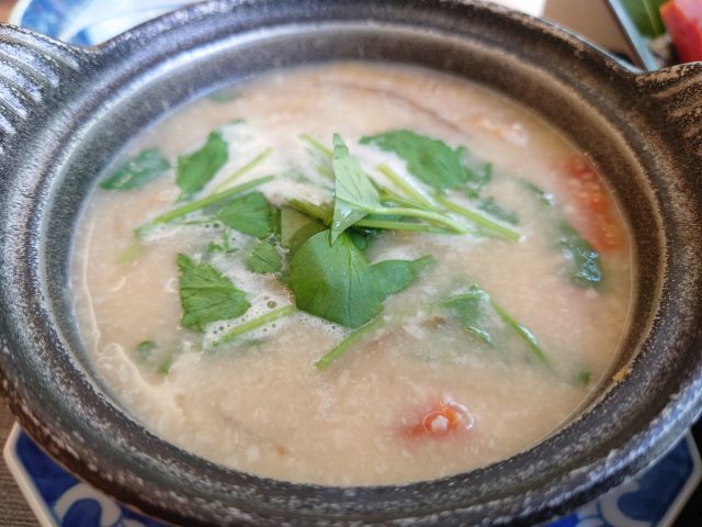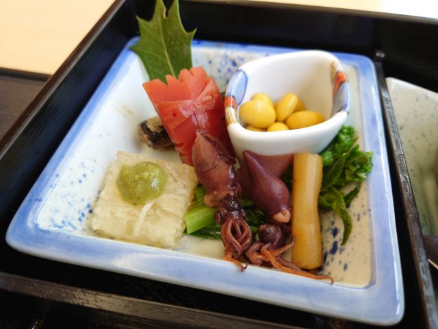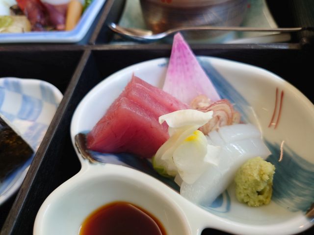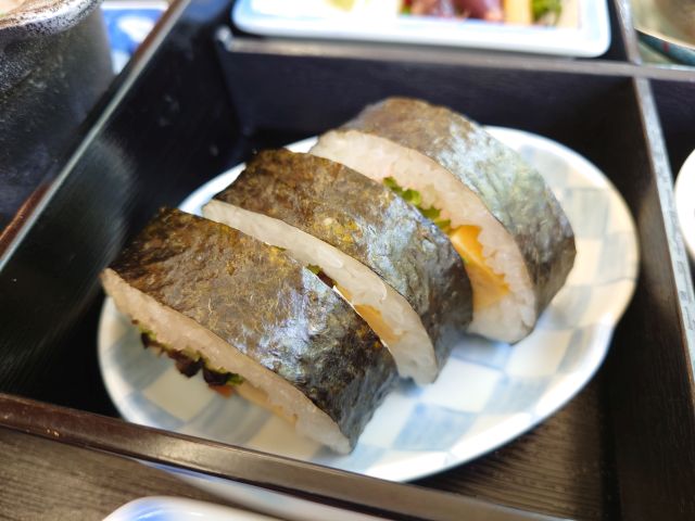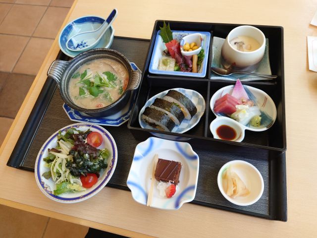 ご飯は巻き寿司で3巻、大きなサイズで食べごたえあります。煮物・刺身(赤身・烏賊)・茶碗蒸しも高品質、小鍋は鮭と根菜の粕汁でかなり量が多かったです。