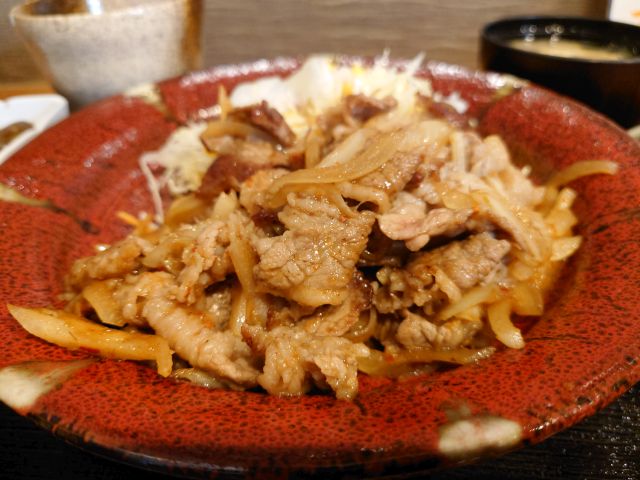 注文はお好み焼き 肉玉そば(750円)、大将が鉄板で丁寧に焼いてくださいます。待つこと10分少々で完成、少し鉄板が遠かったのでお皿で頂きましょう。