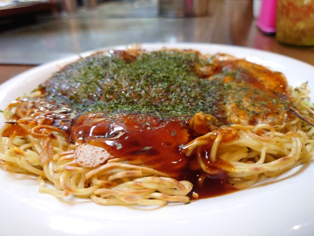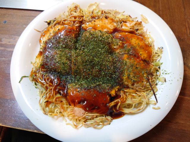 メリケン輪っかは普通サイズ、薄めでパリッと仕上がっています。そばは細麺でこれもカリッと焼かれていますね、全体的にも軽めの食感、本場広島で頂くことが出来るレベルの高いお好み焼きでした!