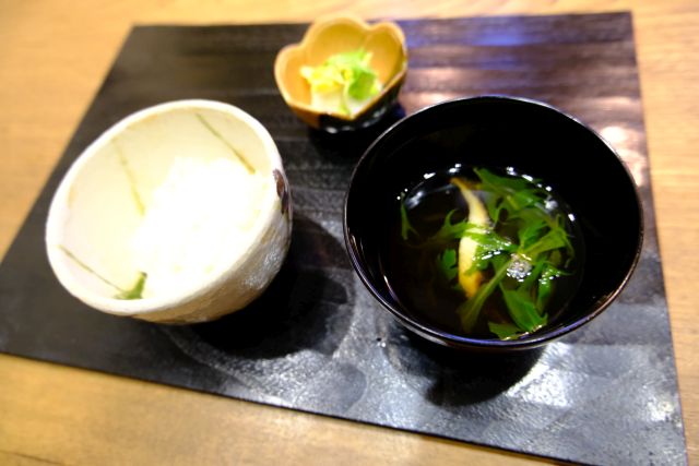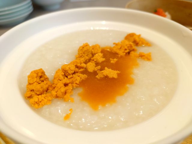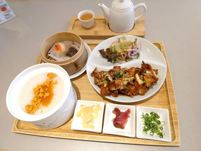 注文は中華粥セットから油淋鶏と点心を選択、待つこと10分ほどで配膳、お粥は5種から選択可能、ウニ粥をチョイスです。