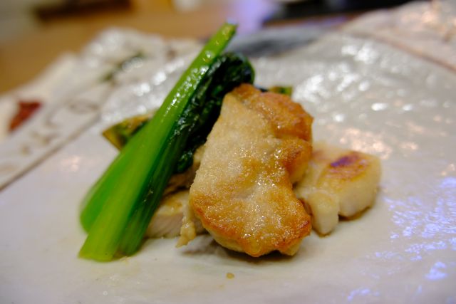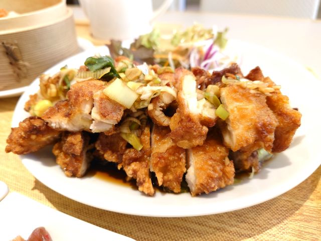 お粥の量は多くないですね、ご飯軽く一杯分程でしょうか、ウニは癖のない味わいで食べやすいです。薬味の梅ザーサイを投入すると味がぐっと引き締まりました。油淋鶏は望外のボリューム、予想の2倍ほどあります^^ 強めに揚がって香ばしい味わいです。点心は二つで量も多くありません、口直し程度でした。