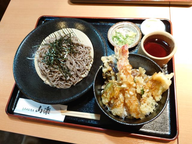 注文はざる蕎麦&ミニ天丼のセット、待つこと10分少々で配膳。定番の組み合わせですが蕎麦だと丼ものとのセットがしっくり来ます^^;