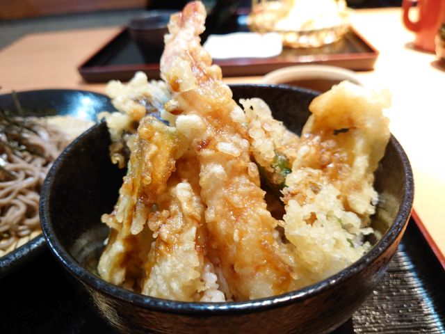 ミニ天丼、想定以上に量があります。天ぷらはどれもカラッと揚がっており甘めのタレが掛かっています。蕎麦とのコンビネーションは最強、ご飯もしっかり入っていました!