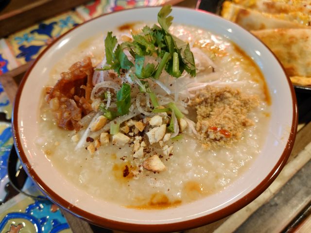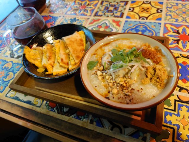 お粥は鶏出汁がしっかり、鶏肉からスープを取る老師仕込みとのこと、旨味がしっかりでどんどんお腹に入っていきます。中にはぶつ切り鶏肉も入っています、ピーナッツや白髪ネギが味のアクセントになっていました!