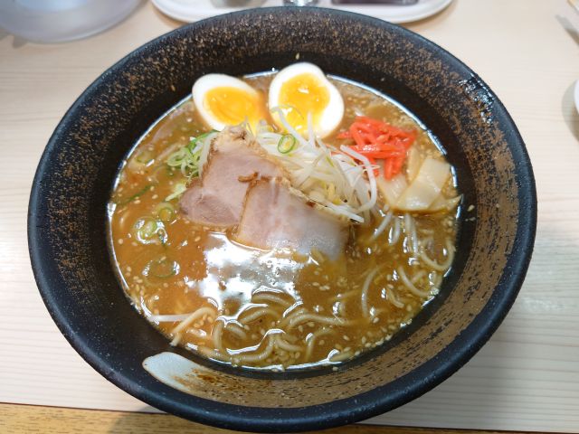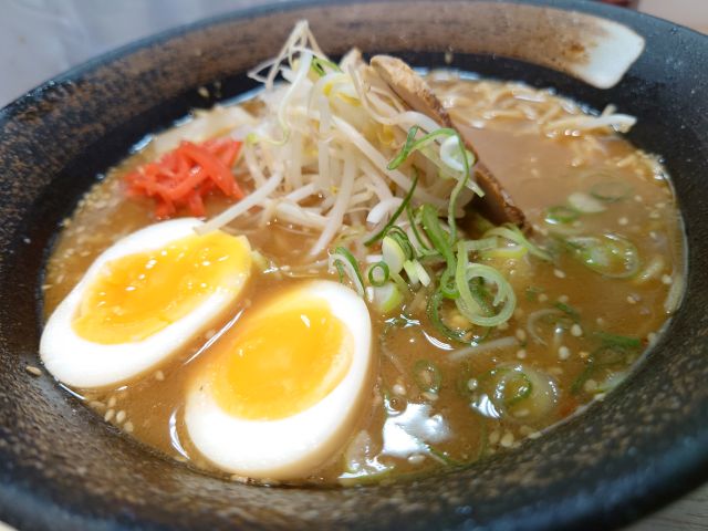 注文は「みそラーメン」+味玉トッピング、ワンオペの時間帯が長くあり着丼まで15分ほど掛かりました。スープは3種の味噌ブレンドで濃厚な味わい、挽きたて白胡麻は風味良かったです。