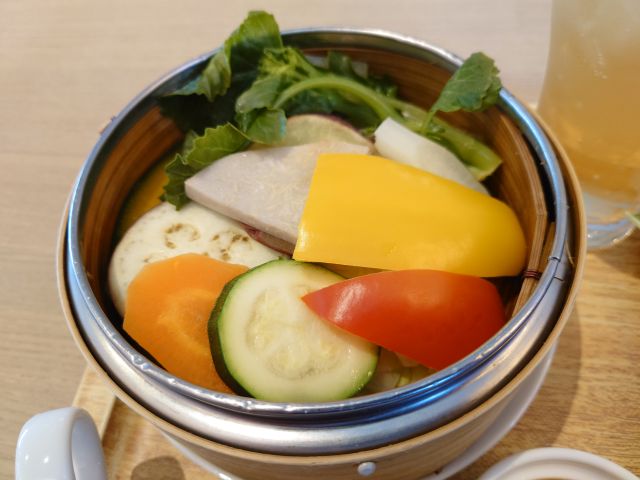 季節のオーガニック蒸し野菜、見た目より量がしっかりありますね、4種のドレッシングでパクパク頂きます。牛すじ煮込みは濃い目の味わい、デミグラスソースがいい感じです。手作りフライドポテトが美味しいですね、もっと沢山食べたいです^^