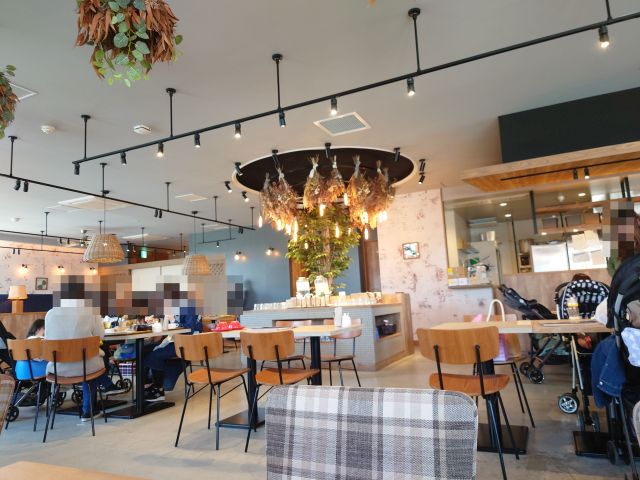 店内は広々空間、天井からはドライフラワーが吊り下げられています。正午頃で8割ほど席が埋まっていますね、女性比率はかなり高いです。