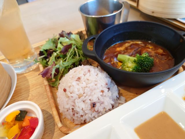 注文は「季節のおとなさまランチプレート」、待つこと15分程でやって来ました。野菜しっかりですね、ご飯も十二穀米で見るからに健康的な内容です。