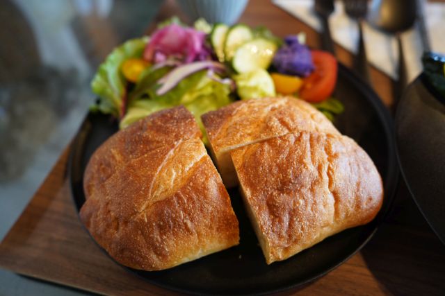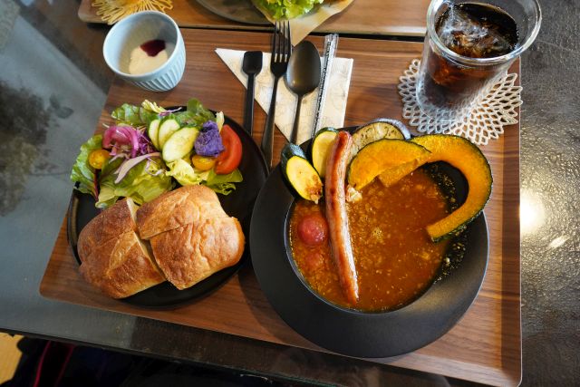 注文「牛すじスパイスカレー」、ソーセージ(+100円)とチーズ(無料)をトッピング、待つこと10分少々でやって来ました。大きなパンが4切れもあります!!