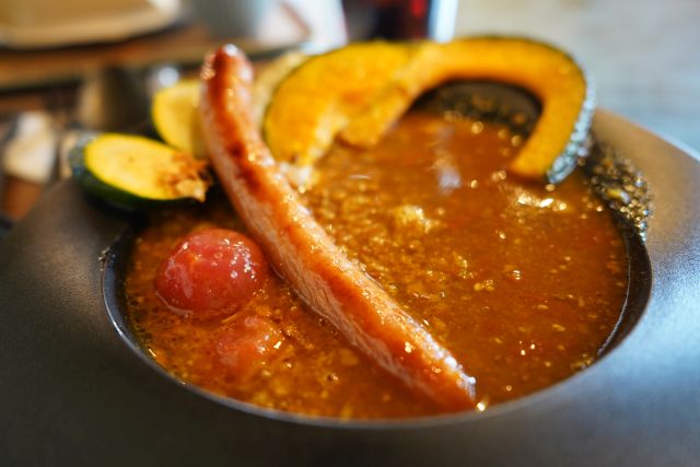 カレーはマイルドな味わい、スパイス感はありますが辛くありません、トッピングのチーズが効いているのでしょう。野菜しっかりが嬉しいですね、トッピングのソーセージも大きなサイズで食べごたえありました!!