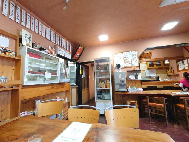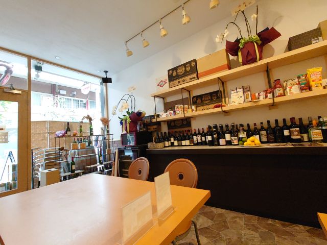 店内は奥に長い空間、手前がテーブル席で奥がカウンター席、壁には沢山のお酒が並べられています...ジュル!