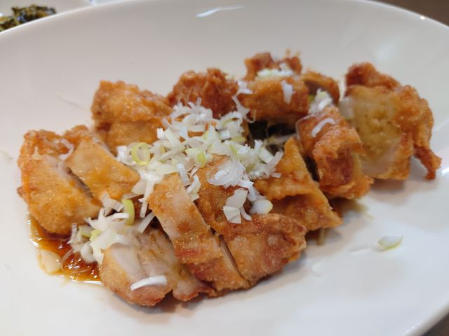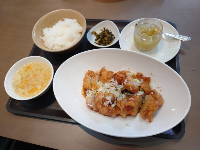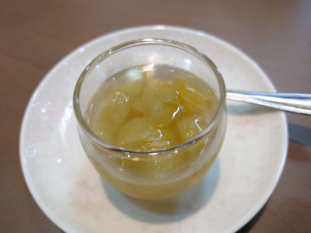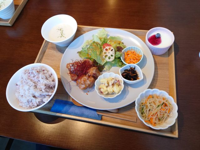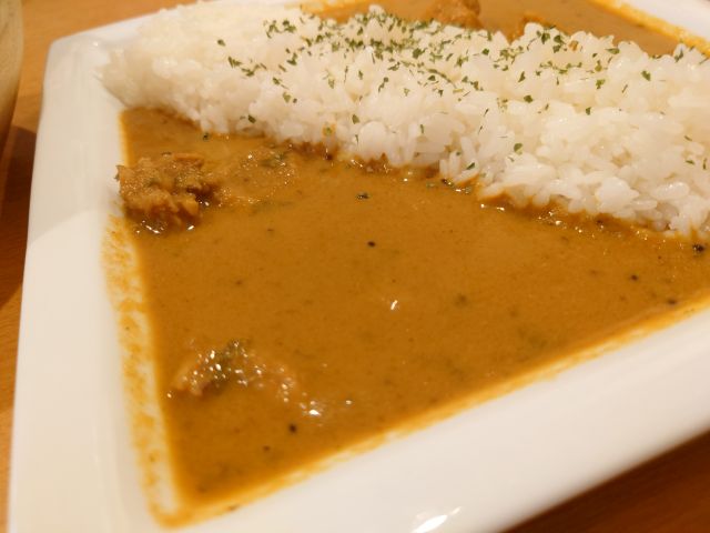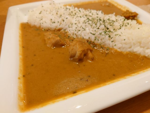カレーはシーフードとチキンのあいがけ、中央のライスで分断されています。フルーティーなルゥは同じでスパイス感はありますが辛さはかなり控えめ、全般健康的な味わいでした。