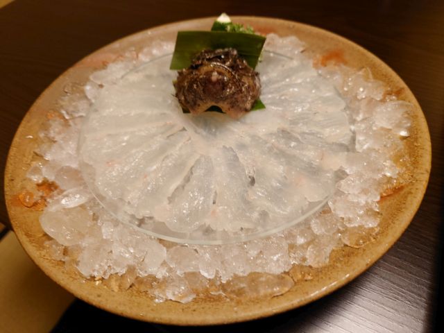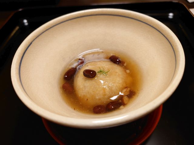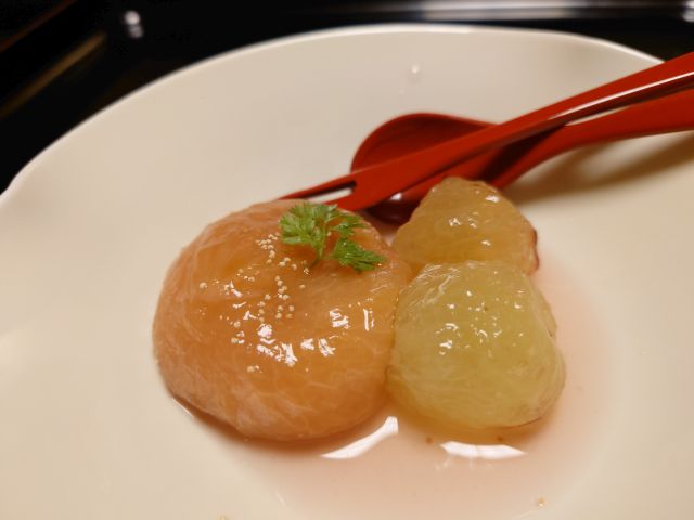 大根まんじゅうは大粒の小豆が入って少し甘い味付け、まんじゅうは粘度高く中がしっかり詰まっています。大きな貝身の酢の物は濃厚な味わい、赤霧島ロックが進みました^^