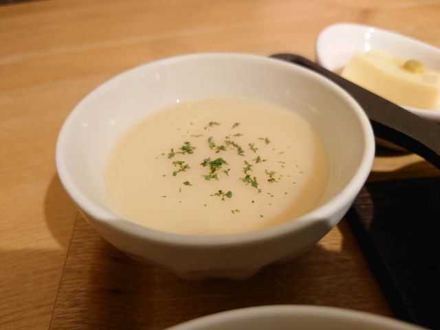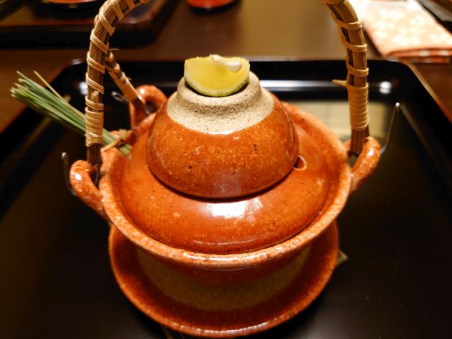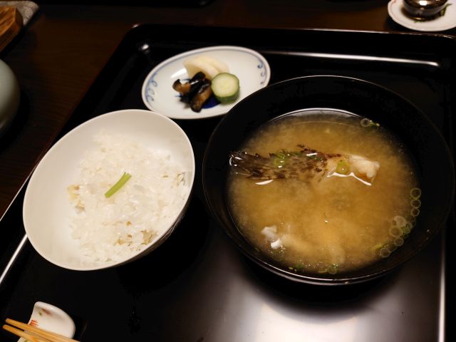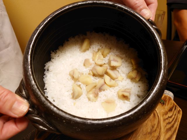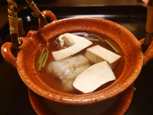 食事は栗ご飯、陶器炊きでご飯がしっかり立っています! 栗量が絶妙でご飯の邪魔をしないのが良いですね。味噌汁には造里のアラオコゼが入っています、出汁がしっかりで美味しいです。
