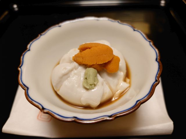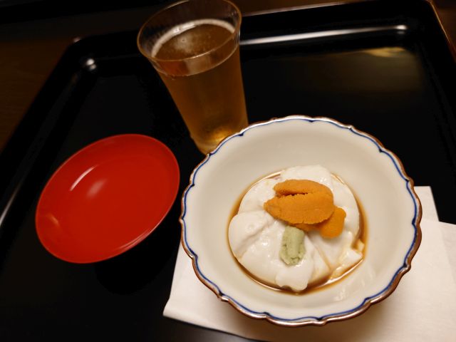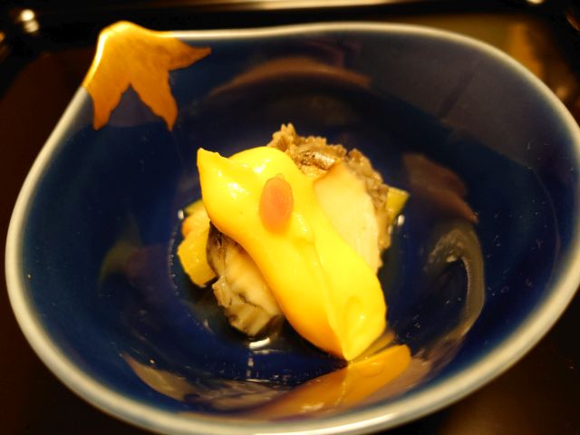 麦酒で乾杯、雲丹豆腐を頂きながら話が盛り上がっていきます。少量の山葵が感動の強さです!。土瓶蒸しは秋の味覚の代表ですね、茸・鱧・豆腐の組み合わせが絶妙、出汁もしっかりです。