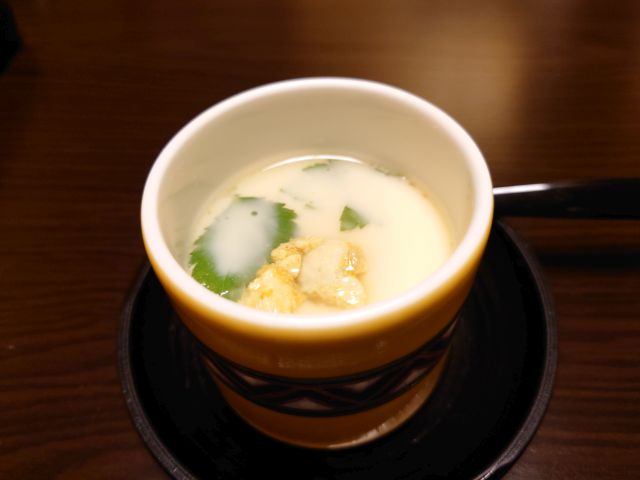 蒸し物は茸と魚、竹皮に包まれてじっくり調理されています、絶妙な軟らかさです。茶碗蒸しも具だくさん、トロトロの卵出汁がいい感じです。