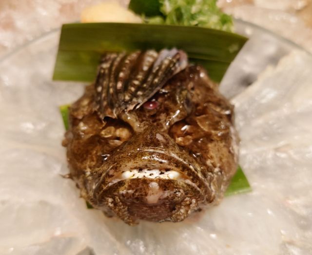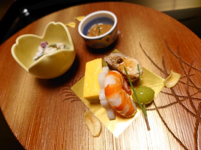オコゼの造里は尾頭付き、顔が怖いです。夏を代表する魚ですが、残暑厳しいのでさっぱり淡白な身をポン酢で頂けるのは最高です。中秋の名月時節、すすきと一緒に登場は旬焚物・和物、銀杏は少し早いですが海老身と一緒に登場、佐藤黒が進みます。