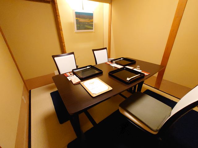 エレベーターで四階へ移動、個室が沢山ありますね。木曜日ですが同階では3組さんの宴席になっています。3人なのでこじんまりした和室、座敷テーブルなので足が楽です。