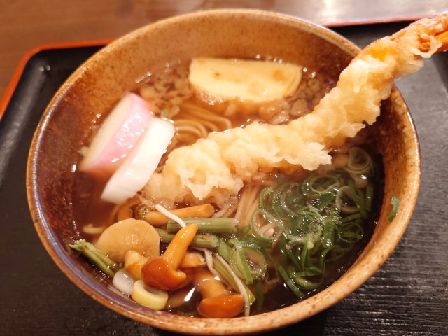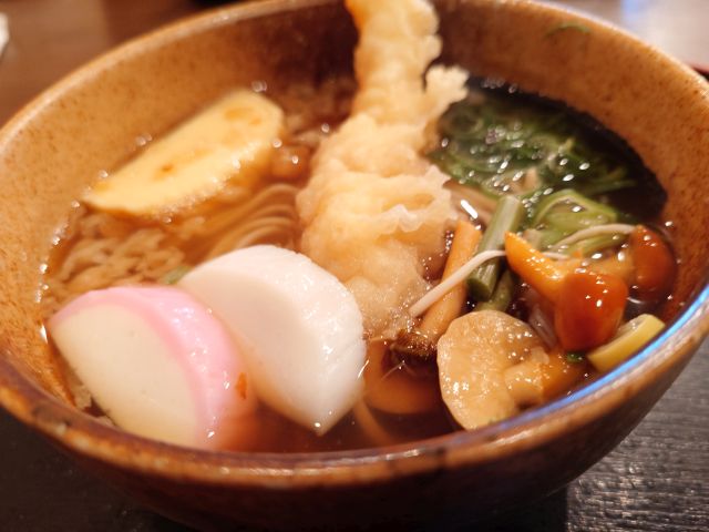 出汁はかつおベースで甘いです、そばは手打ちで綺麗に揃っており、甘めの出汁に馴染みます。揚げたて海老天・紅白蒲鉾・山菜・卵焼き・焼海苔とかなり豪華、大晦日の年越しそばを堪能しました(*^^*)