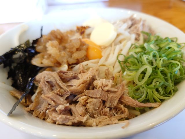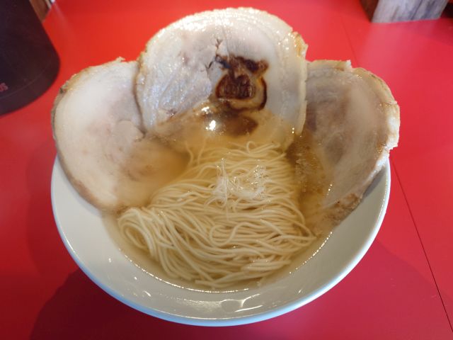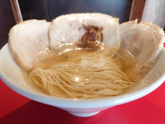 注文はチャーシュー麺、待つこと10分掛からずに着丼、3枚の円形チャーシューが目立つビジュアルです。スープは透明感のある豚骨仕様、見た目より濃厚ですが上質さがしっかり感じられます。