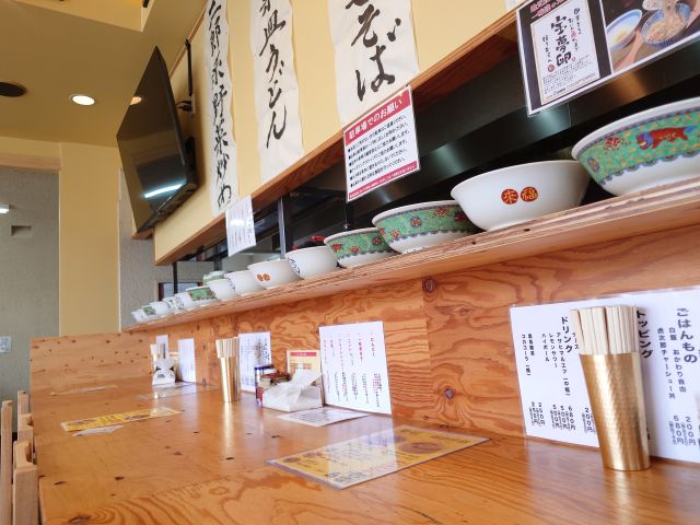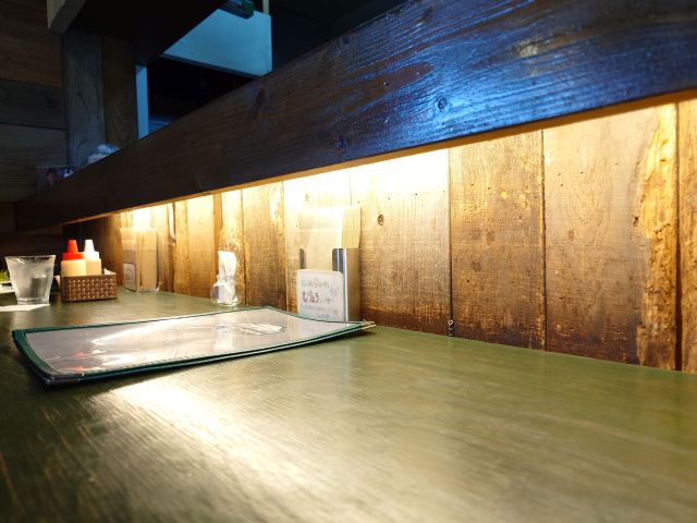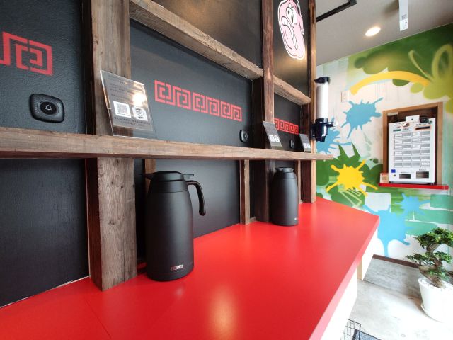 入口右手の券売機で発券、手前のカウンター席に入りブザーを押すと正面扉が開くので食券をスタッフさんに渡します。箸・レンゲ・調味料は着いた席の引き出しを開ければ揃っています。