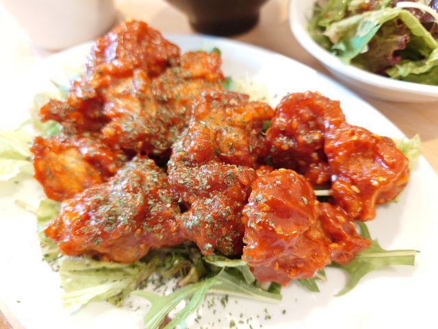 メインは鶏の唐揚げに唐辛子ダレをまぶした感じでしょうか、それほど辛くはありませんね、しっとり感もあってご飯が進みます。サラダ・キムチも上質、全体ボリュームもあって男性でも満足できる量になっています!