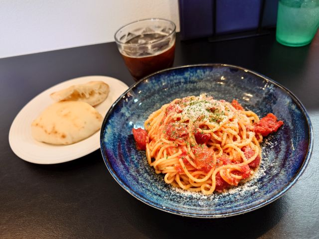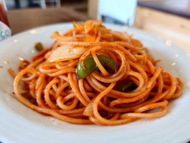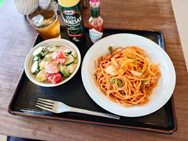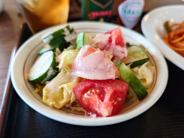 ナポリタンは家庭的な味わいですね、シンプル具材ですがトマトケチャップの量が丁度いい感じ、しつこくないので一定のスピードで頂けます^^ サラダはしっかり量があり、旬のトマトとキュウリが特に美味しかったです。