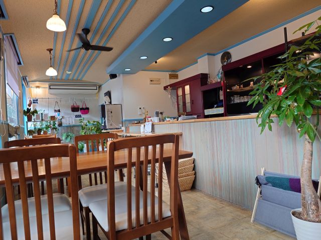 店内は横長空間、カウンター席とテーブル席、正午頃の訪問で先客1名さん、ジモティーさんがのんびりさせています!