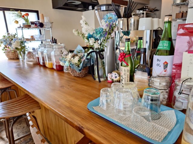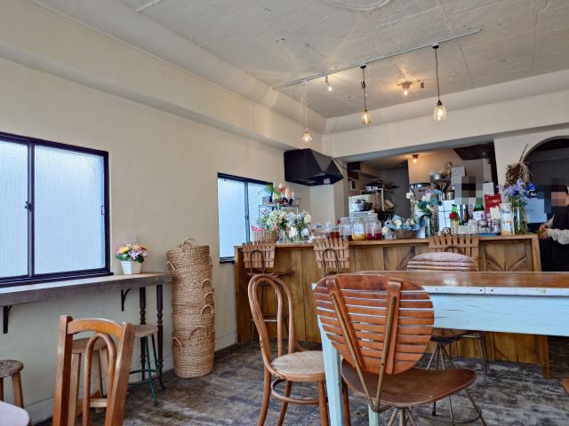 入口すぐのカウンターで注文&支払い、窓際の3人席でのんびりします。内観はシンプルですがお洒落ですね、テーブルにはチューリップが飾られています。