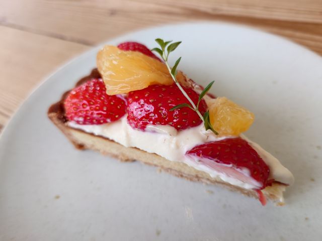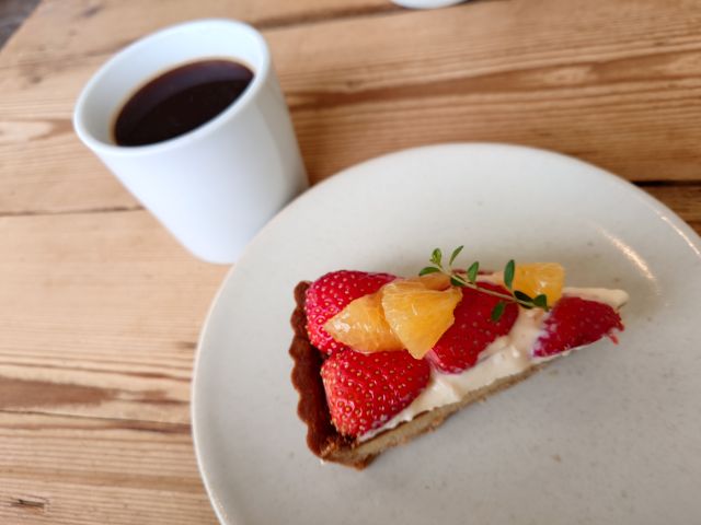 注文は「苺と夏ミカンのタルト(650円)」「アメリカーノ(500円)」、待つこと15分ほどでやって来ました。タルトケーキには大きな苺とオレンジがのっています、クッキー生地は強めの食感、全体的に甘さは控えめなので男性でもOKですね。コーヒーは癖のないブレンド、タルトケーキとの相性も良かったです(*^^*)