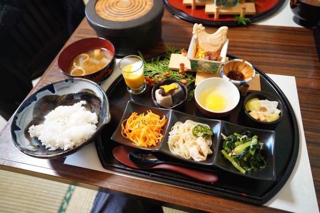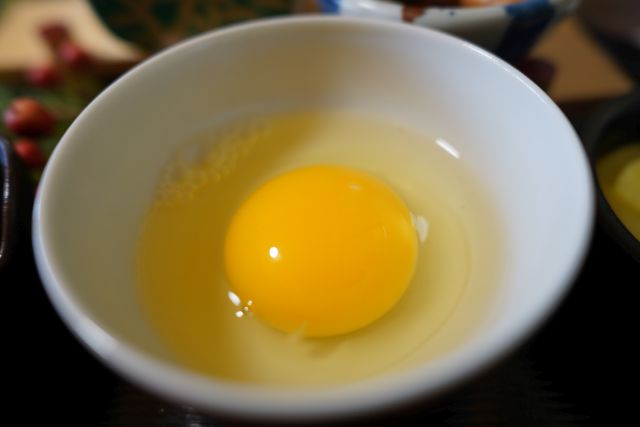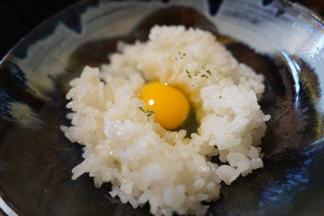 注文は「卵かけご飯定食(1000円)」、蔓牛肉(+250円)・コーヒー(+100円)を追加しました。待つこと10分少々で配膳...小鉢が多くて豪華ですね、これで1Kとは...驚きです(*^^*) 卵かけご飯の最初は平飼い烏骨鶏、レモン色の黄身ですね、燻製醤油を掛けて頂きます、ほんのり甘みありますがスッキリした味わい、炊きたてご飯に混ぜて頂くと至福のひとときです! 二杯目(ご飯はお櫃提供)は平飼い鶏卵、赤身が強く甘みもしっかり、これも最高に美味しいです。