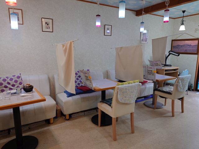 店内は横長空間、中央に入口がありテーブル席が左右に別れます。12時半頃の訪問で店内8割程度の入客です。