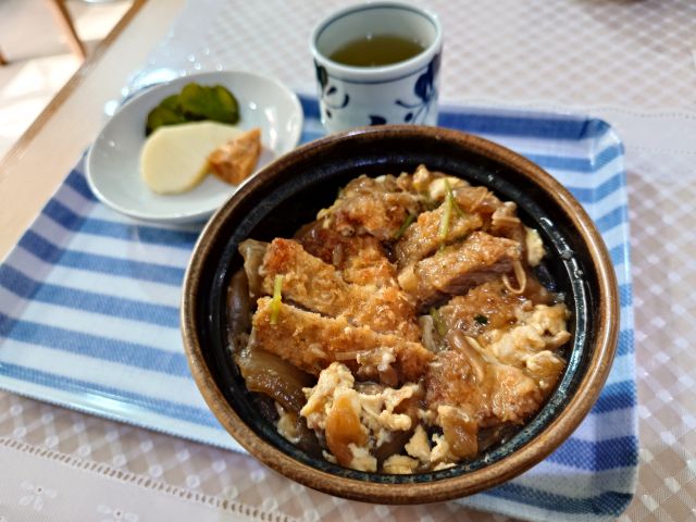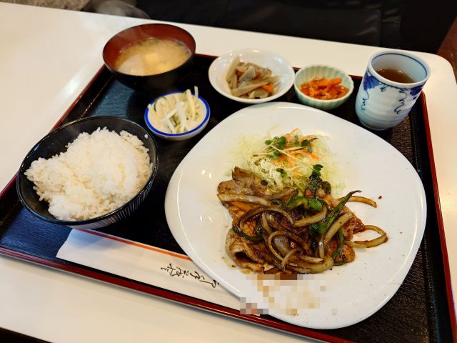 注文は豚ロース焼肉定食(880円)、ベテラン大将が手早く作ってくださいます、待つこと10分少々でやって来ました。メインの他に小鉢3品・ご飯・味噌汁の構成です。
