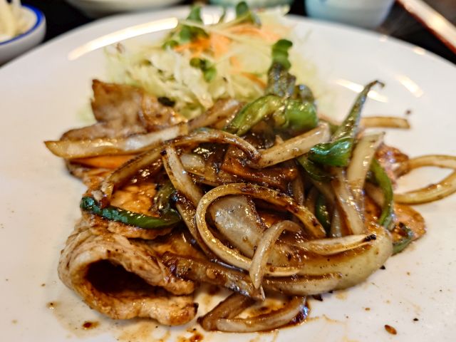 豚ロースは3枚、厚みはありませんが大きなサイズで食べ応えあります。焼肉系の濃いタレで炒めていますので中サイズご飯が進みます、野菜もしっかりでバランスの良い定食でした^^