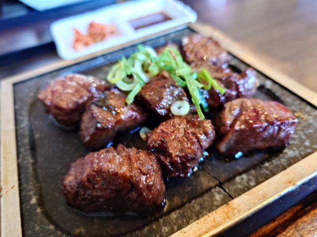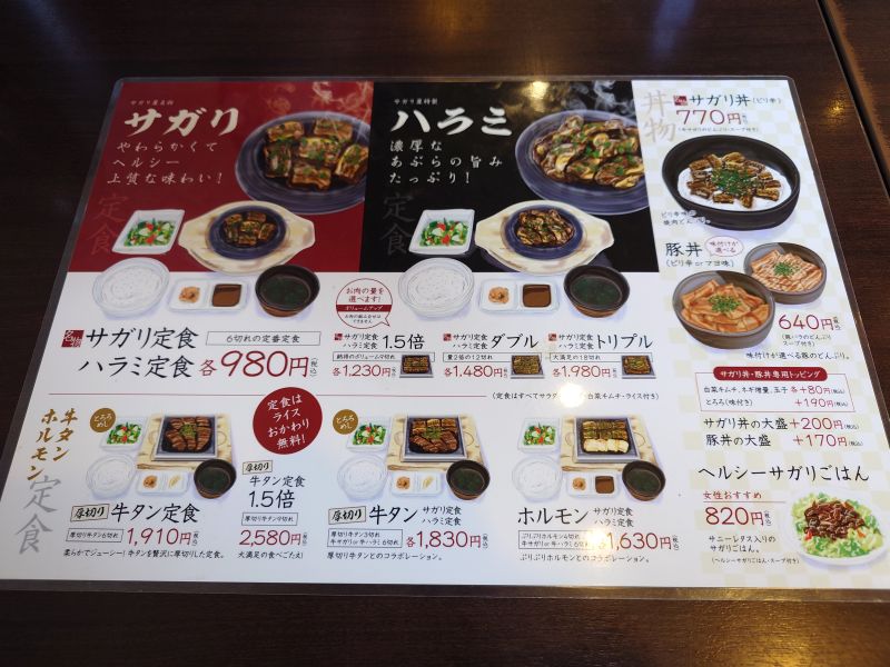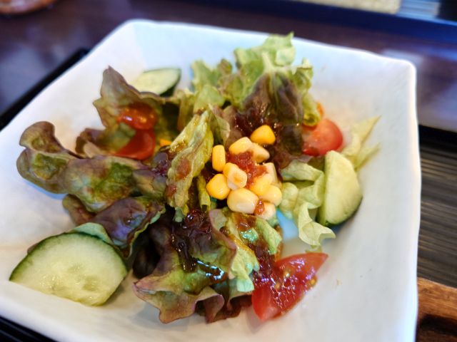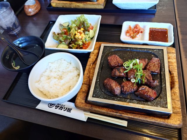 サガリはハラミに近い食感と味わいですがハラミより少しあっさりに感じます、しっとり柔らかくて食べやすいですね、内臓系分類ですが癖のない味でご飯(おかわり可)が進みます、サラダ・わかめスープも上質で満足のサラメシになりました。