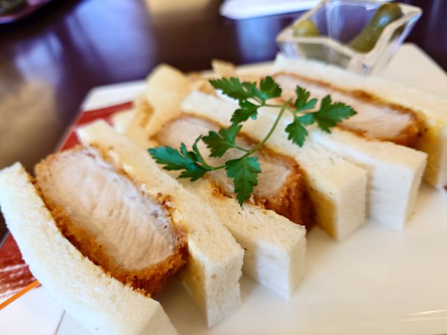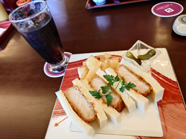 注文はプレミアムカツサンド&アイスコーヒー、待つこと15分少々でやって来ました。サンドイッチにはピクルスとポテトチップスが付いています。