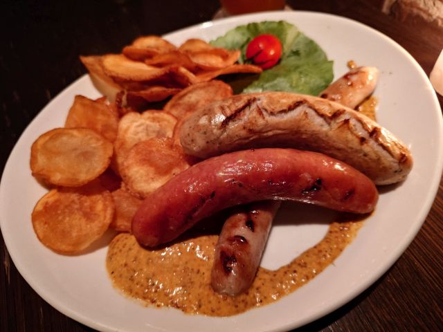まずはビールで喉を潤しましょう、ペールエールはまったりした飲み口でコクがしっかり、マイルドな味わいで飲みやすいです。アテはソーセージ盛り合わせ...量が多いですね、付け合せのポテトチップスが美味いです。カルパッチョは濃厚なソースで頂きます、適量な野菜との組み合わせがいい感じです。