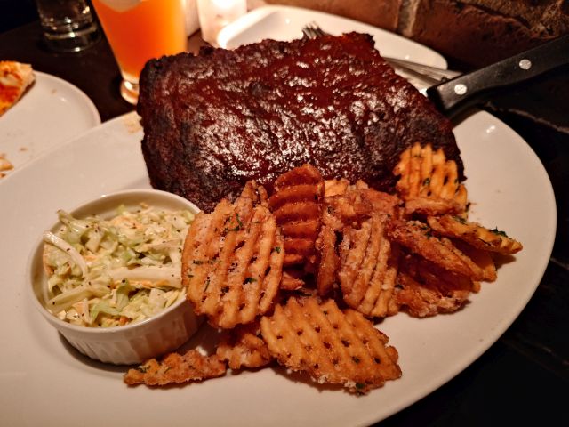リブステーキもハーフサイズですが想像より大きな肉の塊ですね、骨付きですが肉はしっかりあります。濃厚な味付けでビールが進みました!! 付け合せのパルメザンワッフルポテトが激ウマでした(*^^*)