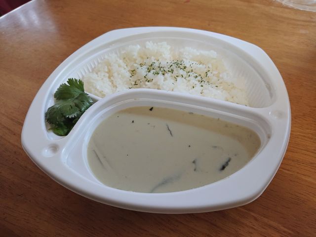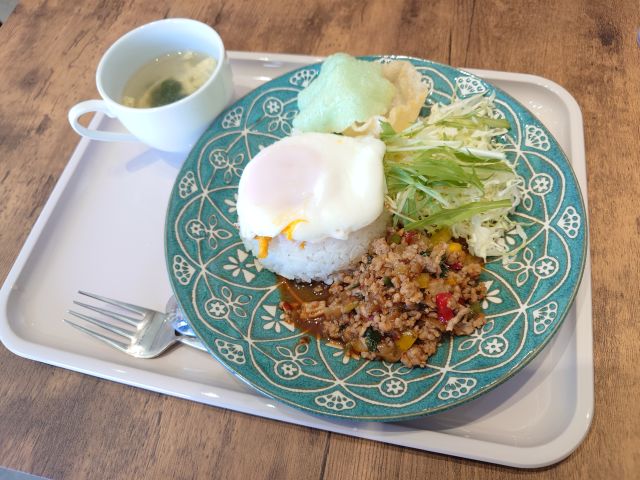 注文は「ガパオライス」、辛さを尋ねられましたので”通常”でお願いしました。待つこと10分少々でやって来ました、卵スープも付いています!