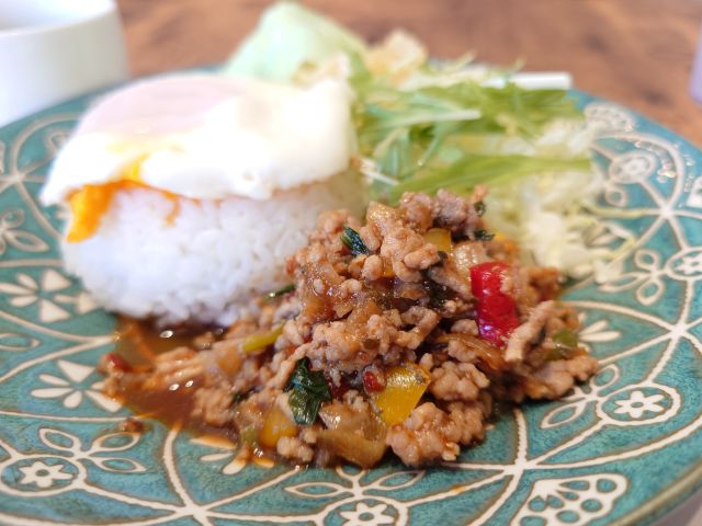 ガパオライス、ひき肉・赤黄パプリカ・バジル・卵等々、具材のバランスがいいです! 唐辛子がしっかり入っており、辛さは思ったより強めですが夏場にはこれくらいが良いでしょう、食欲を増進させてくれます^^