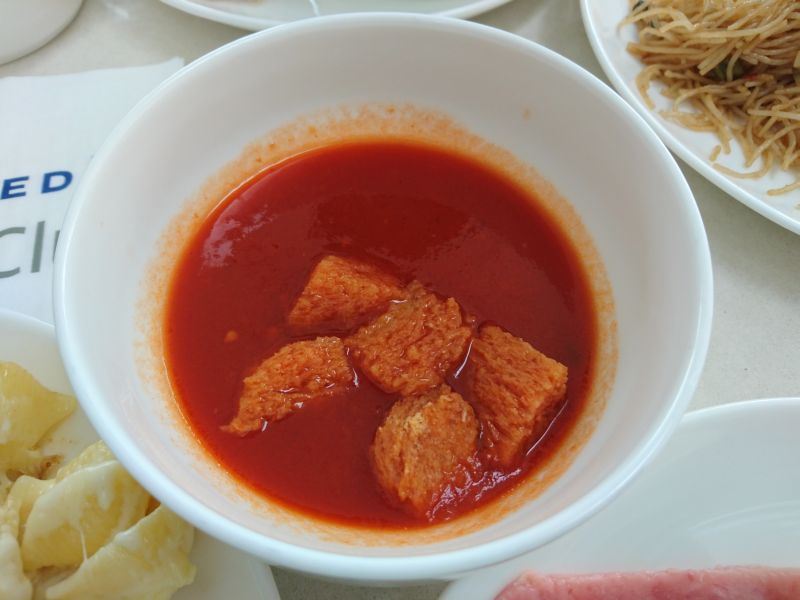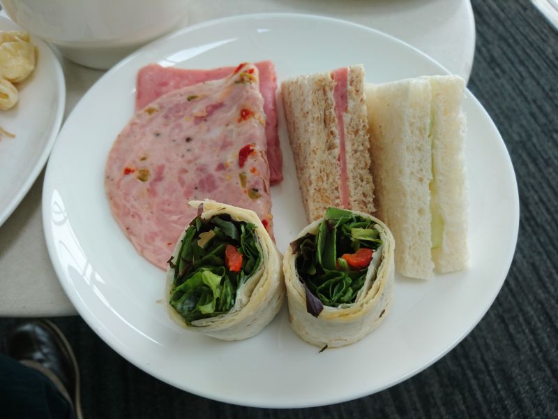 いつもの如く飲食コーナーから適当にチョイス、後から写真を見返すと毎回同じものを食べていますね^^; ビーフン炒め・酢豚・サンドイッチ・生ハム・トマトスープ...出色の味わいではありませんがまぁ無料なのでヨシとしましょう。