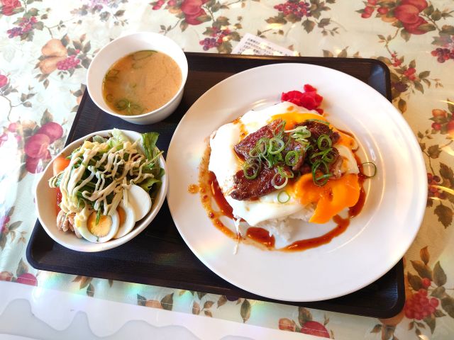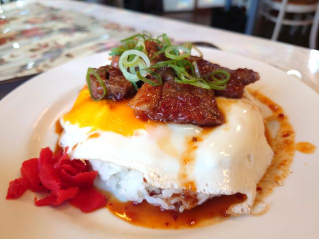 盛り上げたライスの上には目玉焼き、その上にカルビ肉と青ネギがのっています。香ばしいタレが掛かっておりライスがガッツリ進みます。カルビは中サイズが6枚と適量でした。
