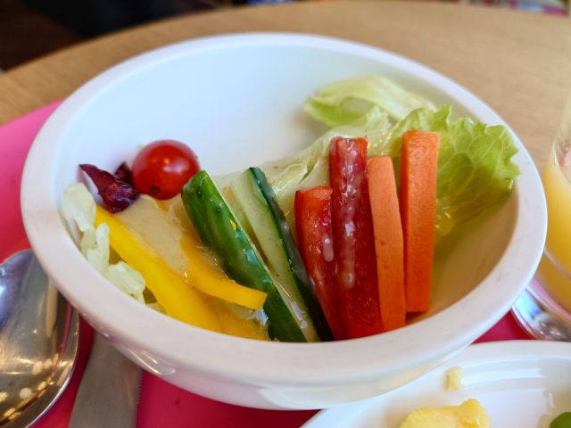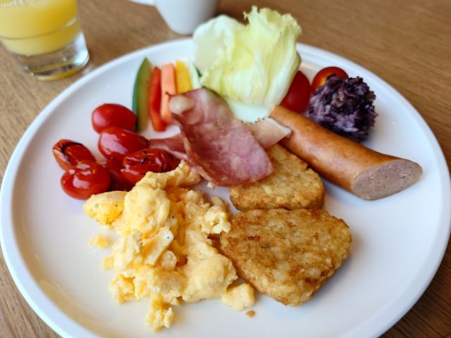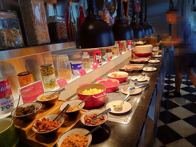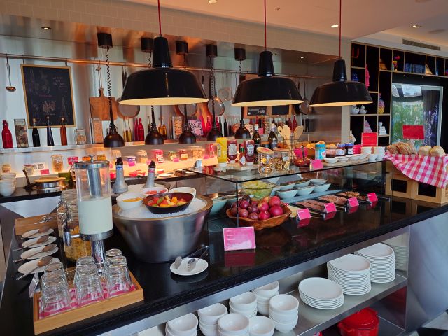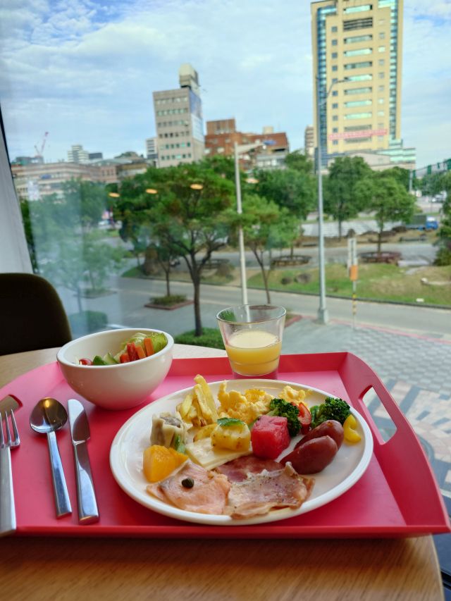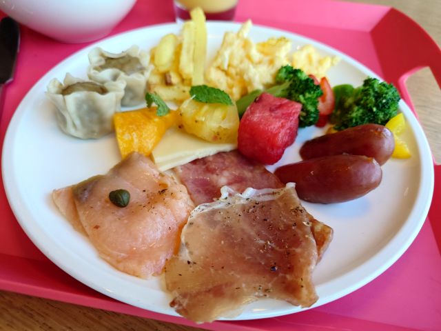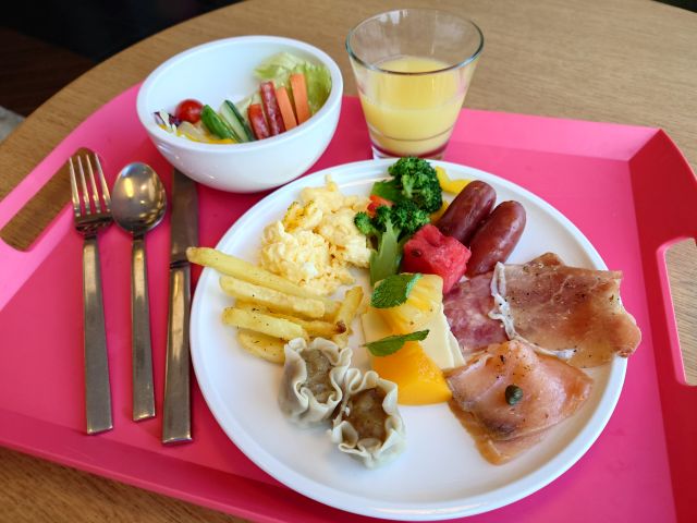 朝食は二階レストランで頂きます、風光明媚な立地ではありませんので近隣のビルと街並みを眺めながらビュッフェ料理を頂きます。品数はサラダも含めてまずまず、お粥・麺類があるのは良いですね、どちらも美味しいです。