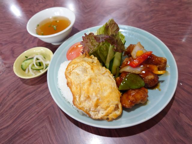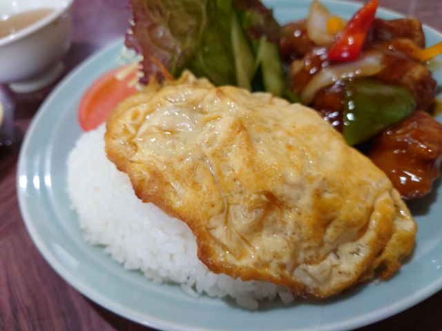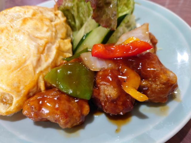 酢豚は肉がしっかり、甘辛い餡がしっかり絡んでライスが進みます!! 野菜とのバランスもよく、美味しい酢豚です。ライスの上の中華風卵焼き&量の多めのサラダも嬉しいです(*^^*)