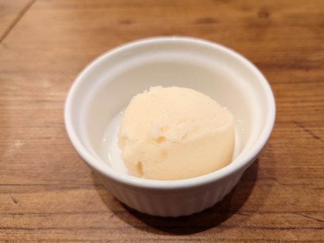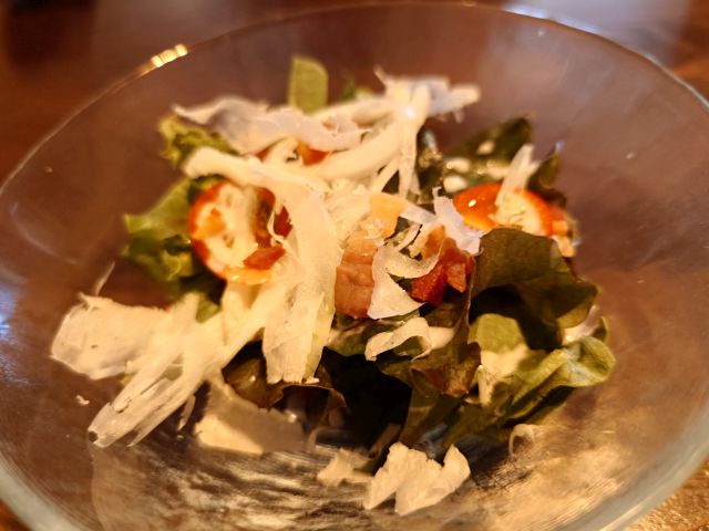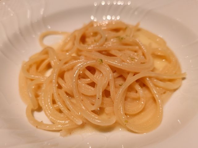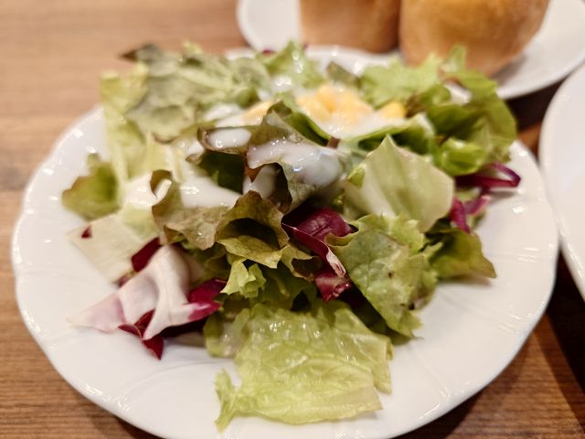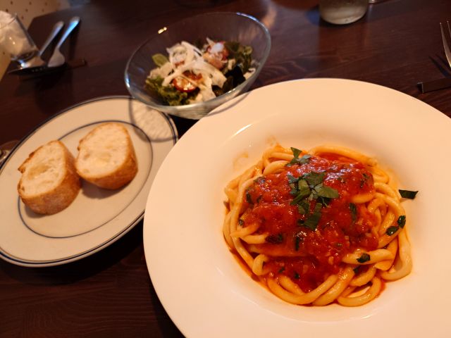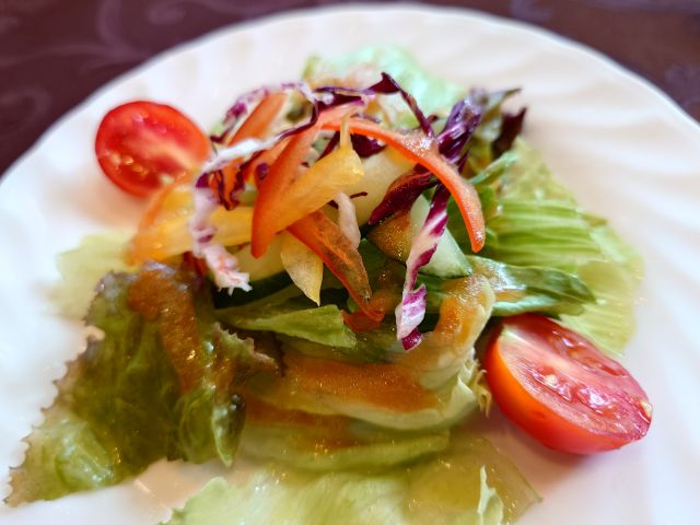 注文は「絶望のスパゲッティ ランチセット(1770円)」、待つこと15分程でやって来ました。メインの他にサラダ・パン・シャーベットの構成です。パスタは大盛り(140g)まで無料です。