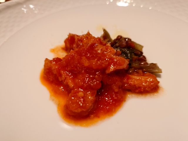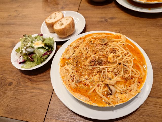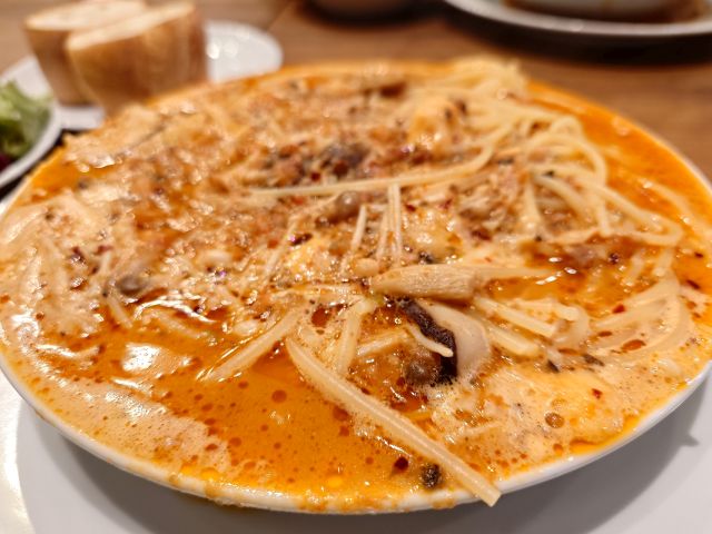 看板メニューの絶望のスパゲッティ、スープがしっかりで受け皿に溢れていますね^^ 自家製ミートソースに大蒜&辛子でインパクトある味わい、辛すぎの一歩手前で旨辛です。パスタは癖のない味わいでスープに馴染む仕様、茸がしっかり入っています。冷めるとチーズが固まるので早めに頂くのが肝要です。