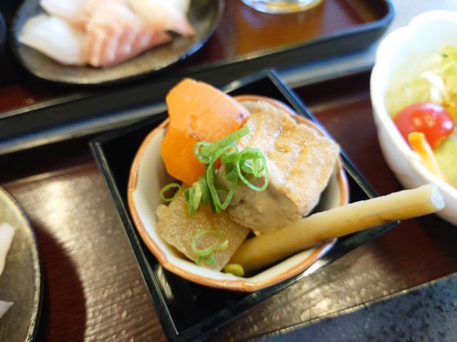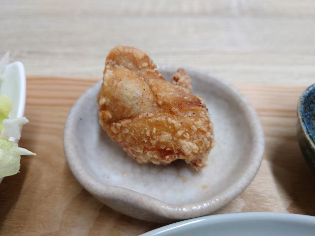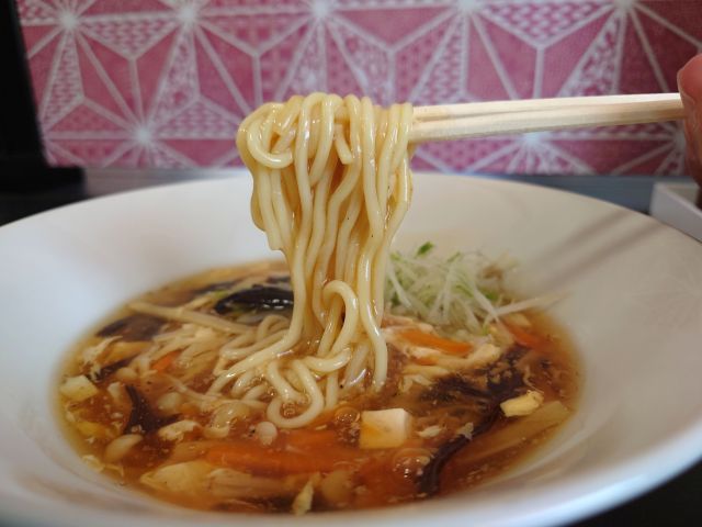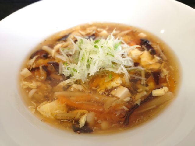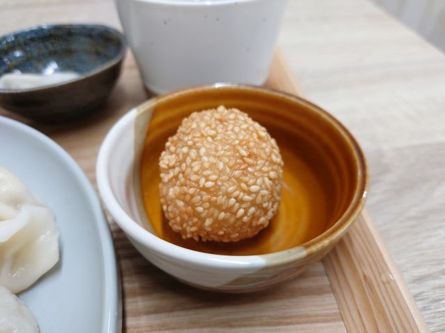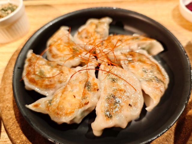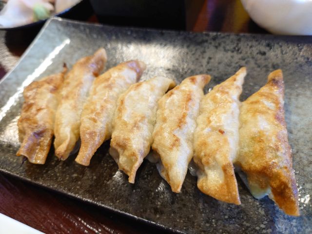 餃子は中サイズが6個、しっかり中身が詰まってパンっと膨らんでいます。良い感じの焼きめで香ばしい味わい、蒸し工程で皮はもっちり食感、糸唐辛子が味のアクセントになっていました!