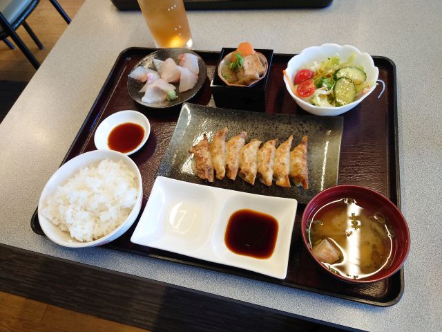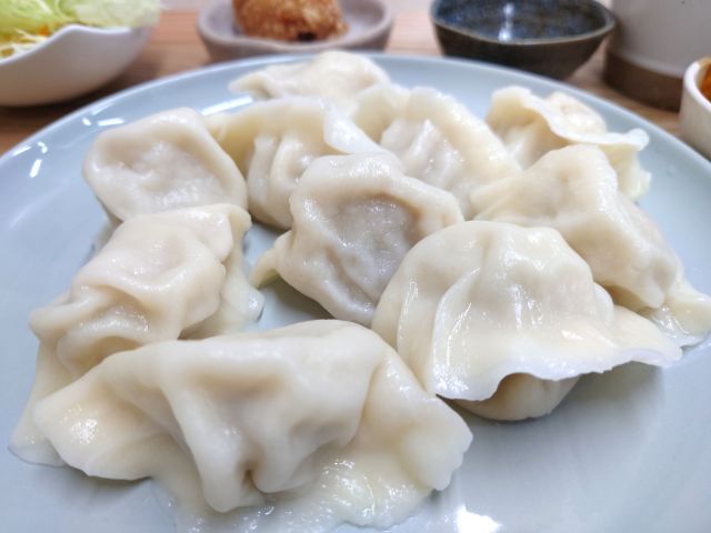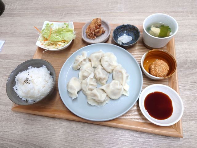 注文は餃子定食、女性スタッフさんが鉄板で餃子を焼いて下さいます。序盤から蓋をして蒸し工程も入りますので期待できます。待つこと10分少々でやって来ました。